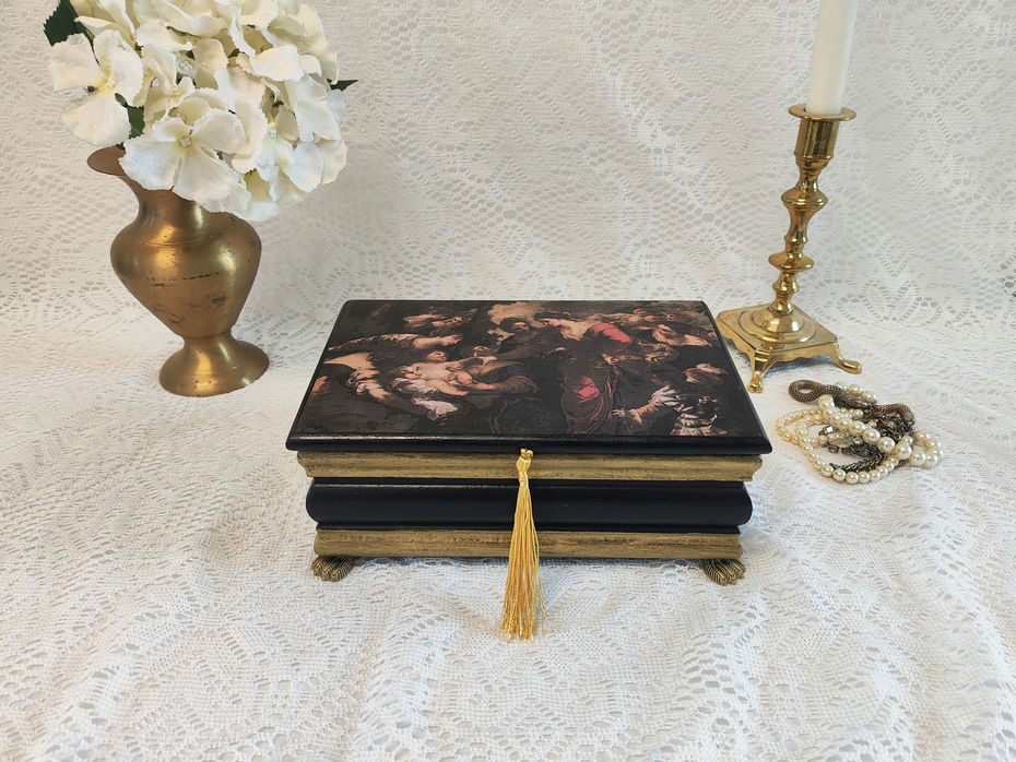 Interiorul căptușit cu catifea oferă protecție delicată pentru piesele tale prețioase, iar finisajele impecabile îi conferă o estetică aparte. Mai mult decât o simplă cutie, este o adevărată moștenire artistică, gata să îți adăpostească comorile într-un mod elegant și sofisticat. Alege să îți transformi colecția de bijuterii într-o poveste!