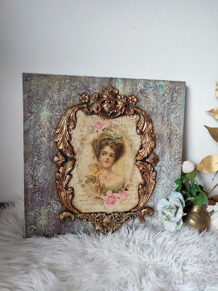 Acest tablou unic, realizat prin tehnici mixte, aduce un plus de originalitate și eleganță oricărui spațiu. Fiecare element a fost atent finisat, ștanțat cu modele și texturi variate, apoi vopsit și ceruit pentru un aspect sofisticat. Procesul de antichizare, realizat cu patină și pigmenți speciali, conferă tabloului un aer nobil și autentic. Accentele sale clasice îmbogățesc decorul interior, completând perfect un stil rafinat și elegant. O alegere ideală pentru cei care apreciază arta deosebită și detaliile bine lucrate.