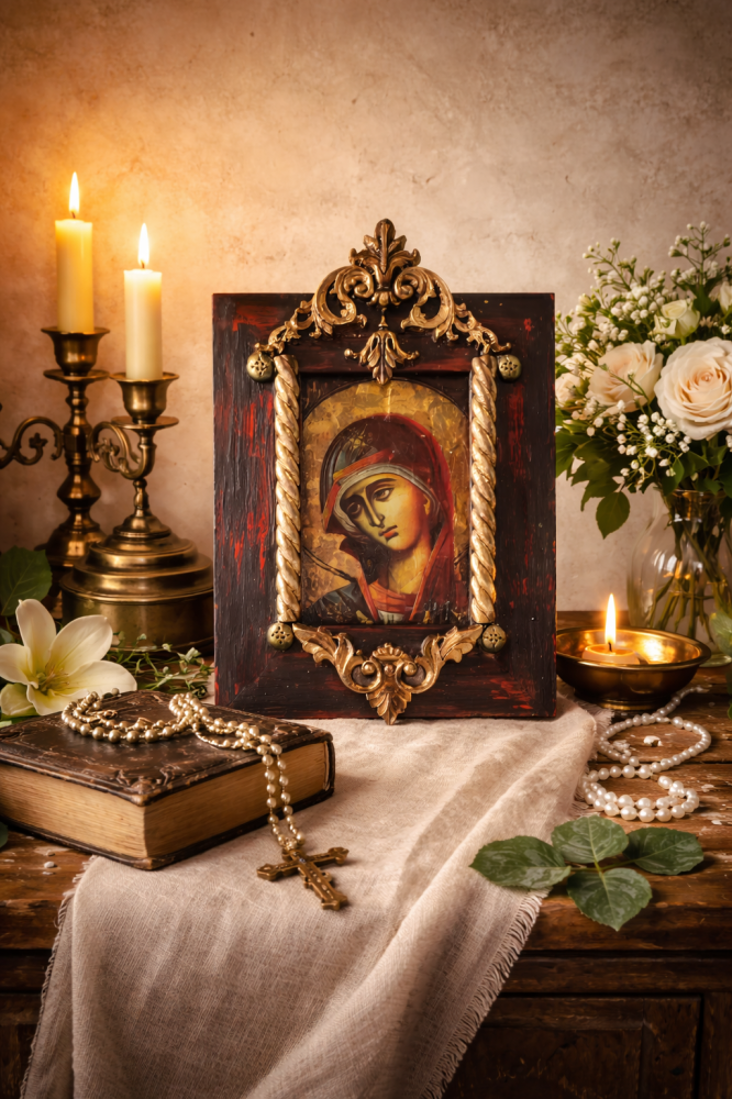 Icoană Maica Domnului cu ramă din lemn – artă sacră pentru perete sau masă