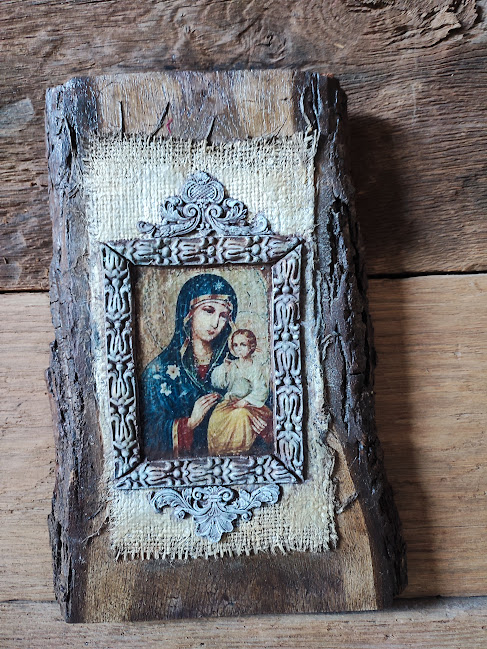 Această icoană unicat este realizată pe un blat din lemn cu scoarta.Decorată cu tehnici mixte,fiecare detaliu reflectă o atenție deosebită.