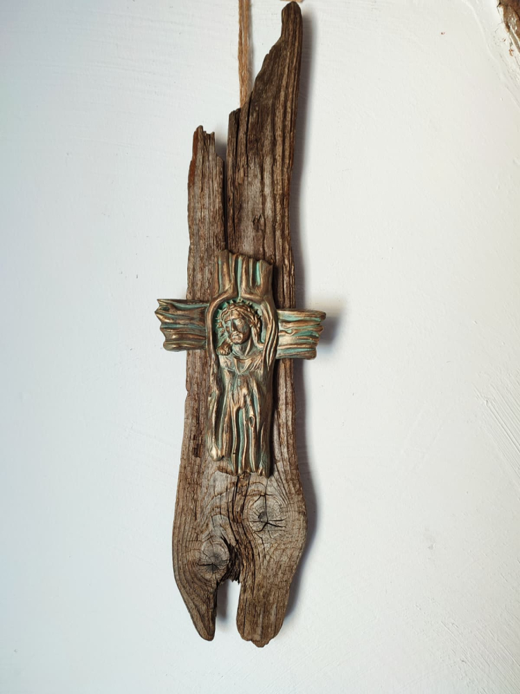 Lucrare unicat pe lemn recuperat din apă, cu textură naturală, crăpături autentice și urme de timp. Pe suprafața lemnului este așezată o cruce turnată manual în gips, pictată și antichizată cu grijă, într-un stil ce evocă vechile icoane de rugăciune. Figura lui Hristos este stilizată, cu linii fluide și expresie senină, integrată armonios în fibra lemnului, ca o îmbrățișare între materie și spirit.