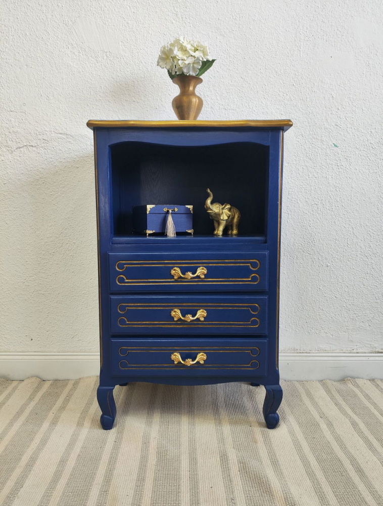 Dulăpiorul este decorat cu magnolii și este vopsit albastru royal.