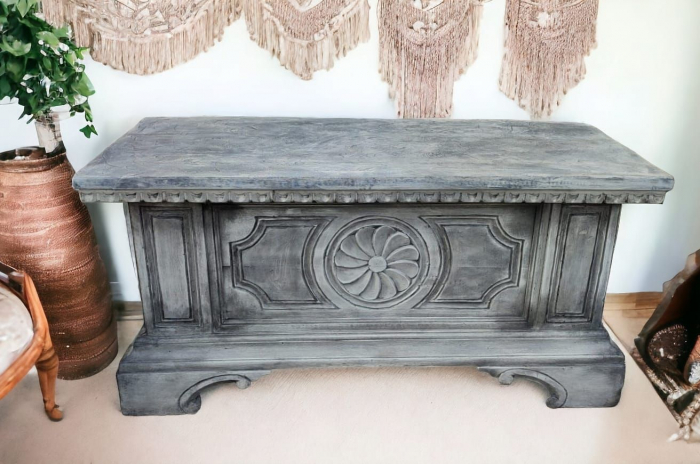 Acest cufar este cu adevarat special. Va sta cu eleganta intr-un decor vintage-rustic, intr-o cabana sau intr-un living dintr-o casa de vis. Poate fi util ca lada pentru perne si paturi, poate pastra cu drag lucruri necesare in casa, iar la nevoie poate fi folosit si cu rol de bancheta in hol,dichisit cu perini moi. Cufăr vechi din lemn masiv,reconditionat și reinterpretat. Pt.acest produs comanda se achita prin transfer bancar,iar costul transportului se calculeaza la finalizarea comenzii.
