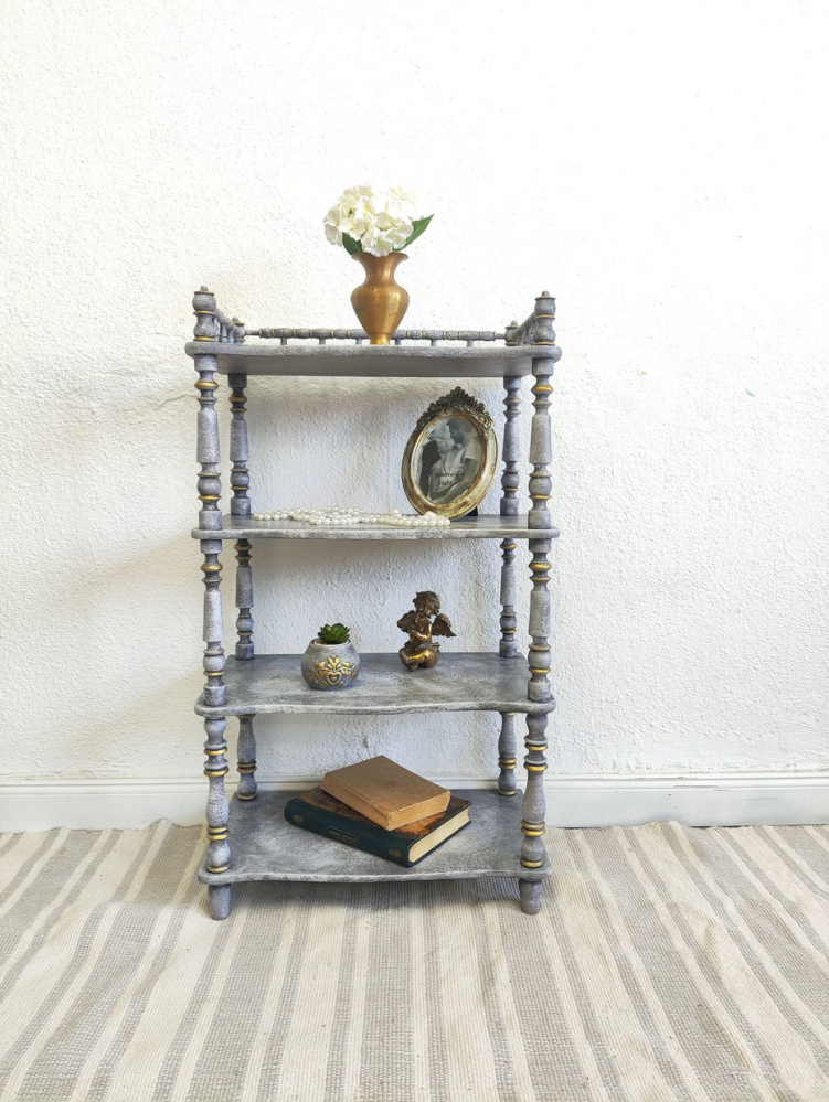 Raftulet vintage reconditionat realizat din lemn,fiind piesa perfecta atat intr-un living mobilat in stil provincial, cat si intr-un hol de intrare larg. Etajera este potrivita pentru expunerea obiectelor decorative ,a cărților sau a ramelor foto ce imbratiseaza amintiri pretioase.